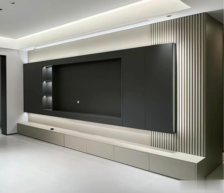 深灰壁龛嵌入电视,竖条纹格栅映光影,灯带晕染,极简奢韵于方寸间流转,尽显现代雅致格调。