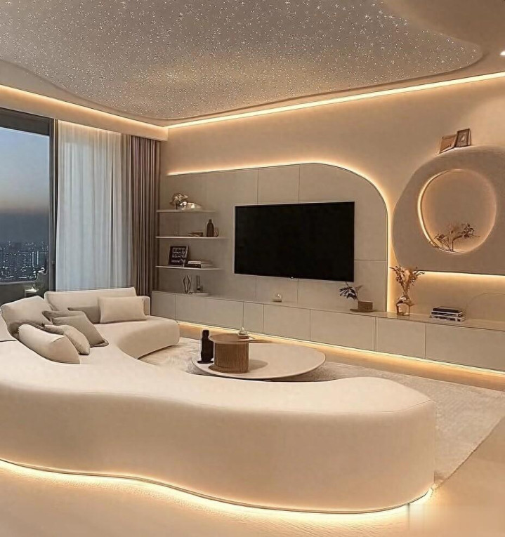 弧形造型墙嵌入式灯带,电视于光影中成焦点,圆形装饰洞藏雅致,置物架陈设生活温度,柔光漫染,奢雅韵味悄然氤氲。